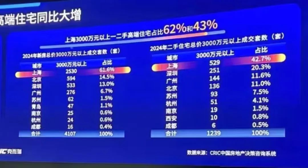 2024年全國3000萬以上的成交,上海一個城市就佔據的半壁江山,把一二手加在一起上海有接近60%的份額
