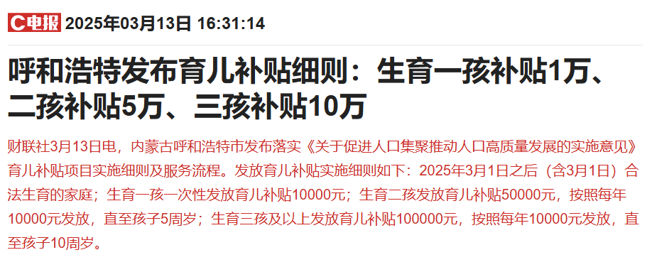 那中國會怎麼發錢呢?在隊長看來,主要有四種方式:**一是,鼓勵生育,給孩子發錢。**生的孩子越多,發的錢就越多。像內蒙古,生三胎,發10萬。這筆錢,放在北上廣深大城市,有些太少了。但放在中西部內陸地區,這筆錢就相當大了。實際上,越是大城市的年輕人,越不願意生孩子。你給他發錢,他也不會生孩子。相反,越是內陸地區的家庭,越是願意生孩子。很多家庭不是不想生,而是養不起。那政府發錢,就能減少養育壓力,鼓勵很多中西部的家庭多生孩子。