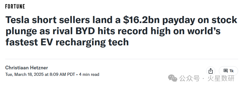 《FORTUNE》表示,特斯拉多頭現在過得很艱難。在遭受了前所未有的股價暴跌,使賣空者獲利162億美元后,主要競爭對手比亞迪剛剛慶祝了歷史新高。