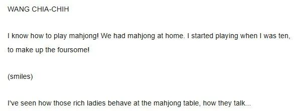 為了拍好這幾場麻將戲,不懂麻將的李安專門找來台灣的老演員李嘉茜(也曾是李翰祥的電影顧問)作為麻將指導。
