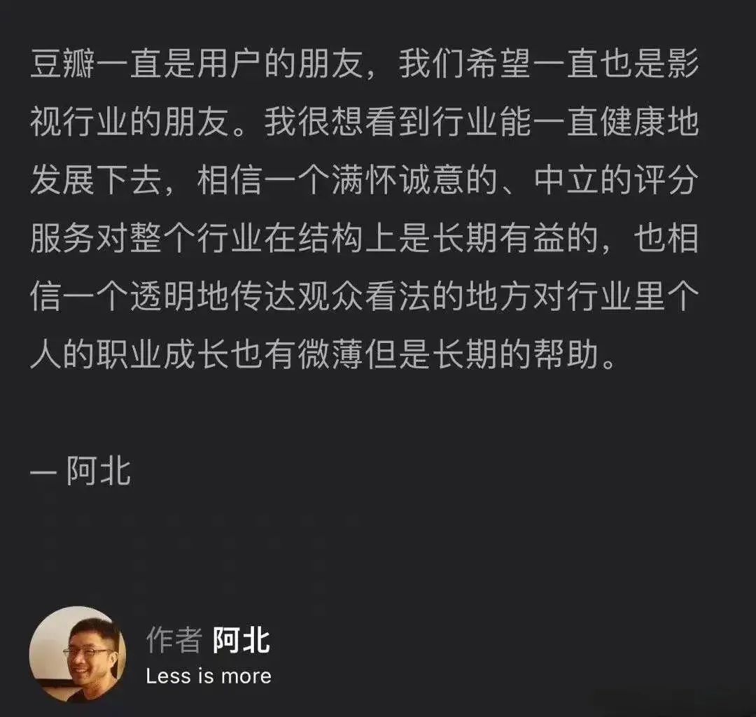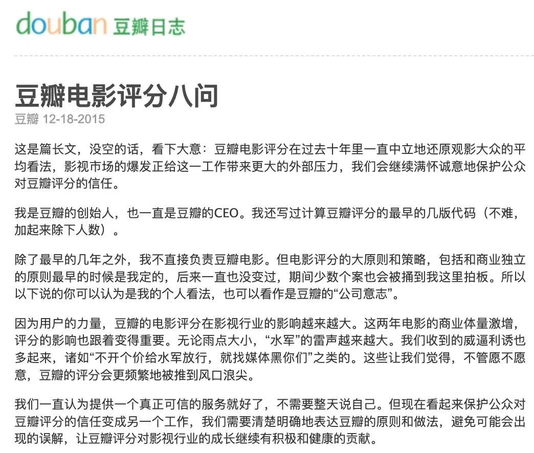 這份“歷史文件”,至今仍指導着豆瓣評分的運行,即豆瓣影評是屬於大眾用户的,不會被少數專業影評或商家操控。