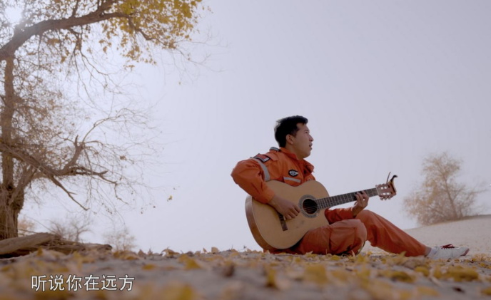 那是護林員依布拉音日落下的背影,一個人靜坐在鋪滿落葉的胡楊樹下,指尖撥動吉他,開始吟唱一首維吾爾族的古老民歌《戈壁灘》,歌詞表達了遠行的旅人對心中愛人的思念,正是依布拉音對遠在百公里外的妻子的傾訴。低沉而又温柔的歌聲在蒼茫無邊的沙漠中悠遠飄揚,我不再看監視器,只想安住在這淡淡的憂愁和莫名的感動中。