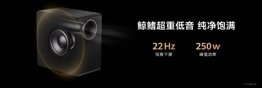 二是鯨鰭超重低音。在家庭影院中,重低音箱是一個不可或缺的角色,不僅讓聲場更完整,還能實現體感與聽覺的神經耦合。鯨鰭重低音箱實現了22Hz 的低音下潛,帶來超強震撼,在滿足聽覺的同時還能帶來更豐沛的體感滿足。