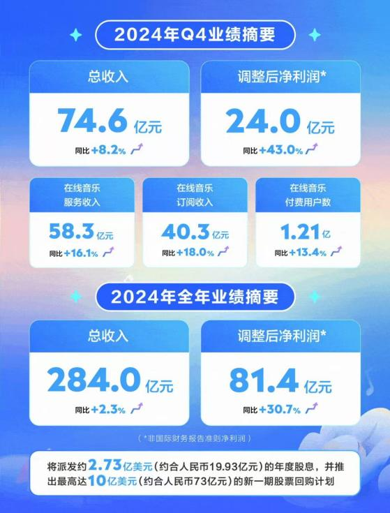 2024年第四季度,騰訊音樂總收入為74.6億元,同比增長8.2%,調整後淨利潤24.0億元,同比增長43.0%。主要得益於在線音樂服務收入同比強勁增長,部分被社交娛樂服務和其他服務收入下降所抵銷。