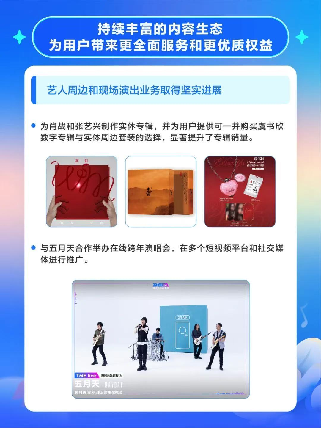 在藝人周邊和現場演出業務上,為肖戰和張藝興製作實體專輯,為用户提供虞書欣數字專輯與實體周邊捆綁購買選項,顯著提升專輯銷量;與五月天合作舉辦在線跨年演唱會,並藉助多個短視頻平台和社交媒體進行推廣,吸引海量用户觀看,打造了現象級音樂盛事,極大增強了用户對平台的粘性與歸屬感。