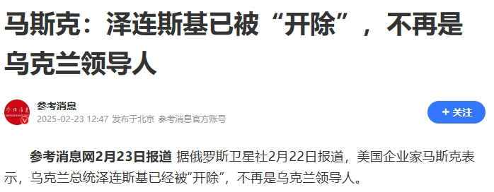 等到特朗普想要俄烏和平談判時,馬斯克在網上又宣稱:“烏克蘭總統澤連斯基已經被‘開除’!”