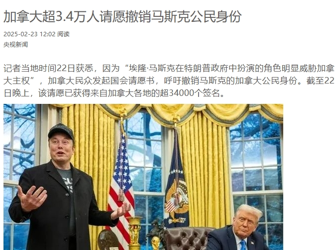馬斯克在擔任特朗普政府顧問後,協助“打壓”加拿大,但馬斯克持有加拿大國籍,相當於變相損害自己國家利益,被加拿大民眾批評,數萬人情願要求加拿大撤銷馬斯克的公民身份。