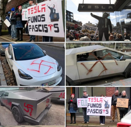 然後是全國各地爆發反馬斯克示威,隨後演變成大量特斯拉當街被噴漆和砸車事件,人羣舉着“馬斯克是納粹”“燒燬特斯拉”的標語抵制“馬貨”,在路上隨機打砸看到的任何特斯拉汽車。