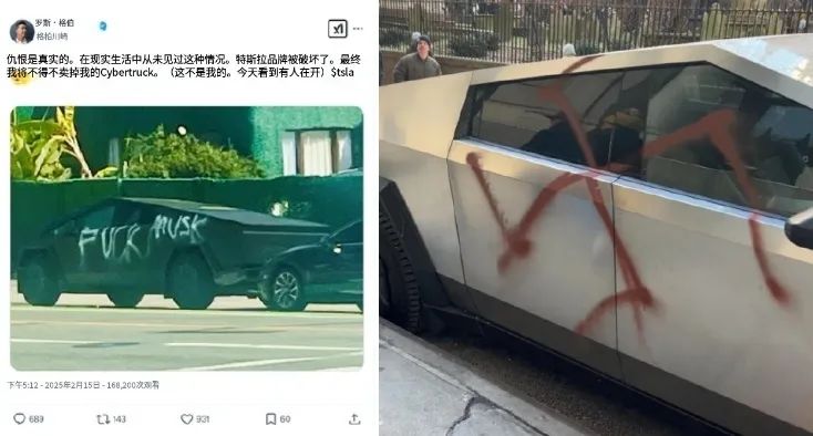 ▲近期被打砸的特斯拉汽車上噴有萬字符或者“馬斯克法西斯”的標語