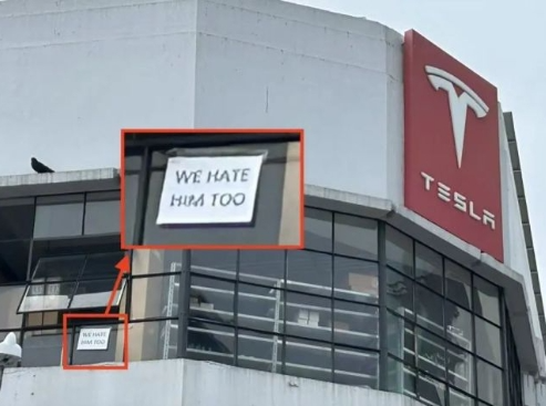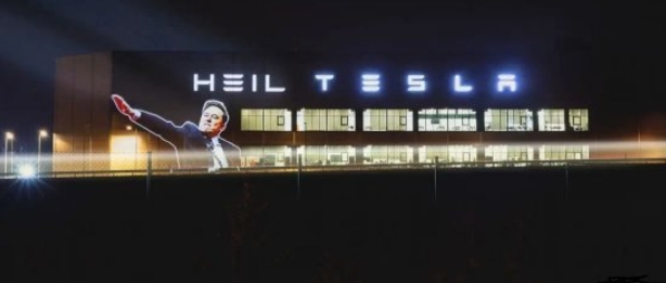 更嚴重的是,特斯拉各地的工廠也出現反對馬斯克的動作,比如德國柏林的特斯拉工廠大樓上出現馬斯克的“納粹手勢”和德語“Heil 特斯拉”的投影。一些美國特斯拉經銷商店為了防止被打砸,掛出“我們也恨他”的標語。