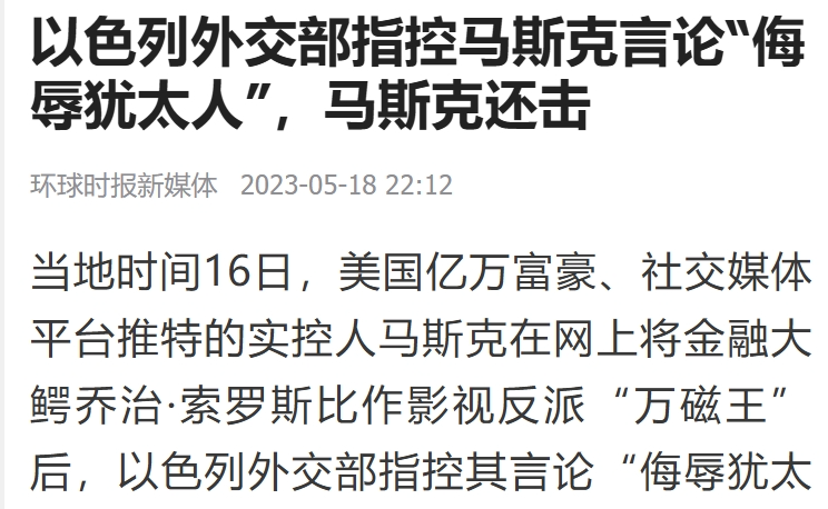 2023年巴以衝突期間,馬斯克在反猶太主義帖子下方留言“你説出了真相”,被指反猶。引發歐盟委員會、蘋果、迪士尼、康卡斯特(美國第一大有限電視公司)等多家廣告商抵制,將不在X平台上投廣告。