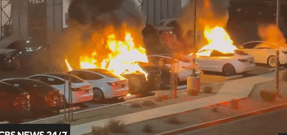 3月18日美國拉斯維加斯,一名黑衣人持槍向特斯拉4S店(服務中心)門前的數輛特斯拉汽車開槍掃射,然後用燃燒瓶縱火燒燬了5輛特斯拉。