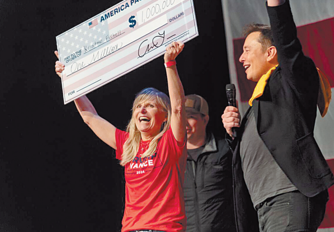 2024年,馬斯克公開支持特朗普,捐贈數億美元幫助特朗普選舉,還在10月份每天抽取一名“支持言論自由與持槍權”的搖擺州選民獎勵100萬美元。相當於站在了民主黨的對立面,得罪一半美國人。