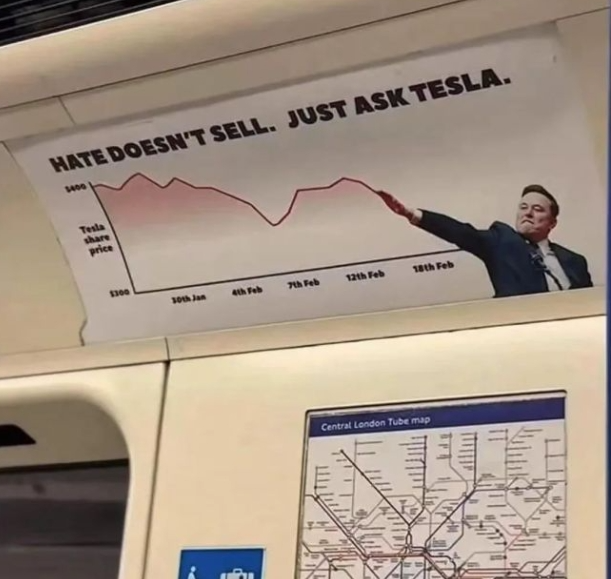 ▲德國地鐵裏貼着嘲諷馬斯克“納粹手勢”和他的股票下跌曲線