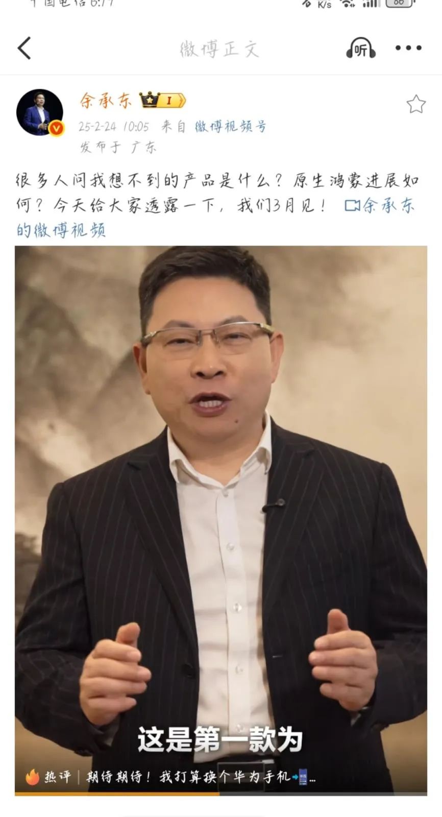 1月28日,餘承東在抖音上發佈視頻《別人想不到的產品三月見!》,期間餘承東透露華為3月將推出一款“全國人民買得起、想不到的產品”,當時還引發外界廣泛關注。