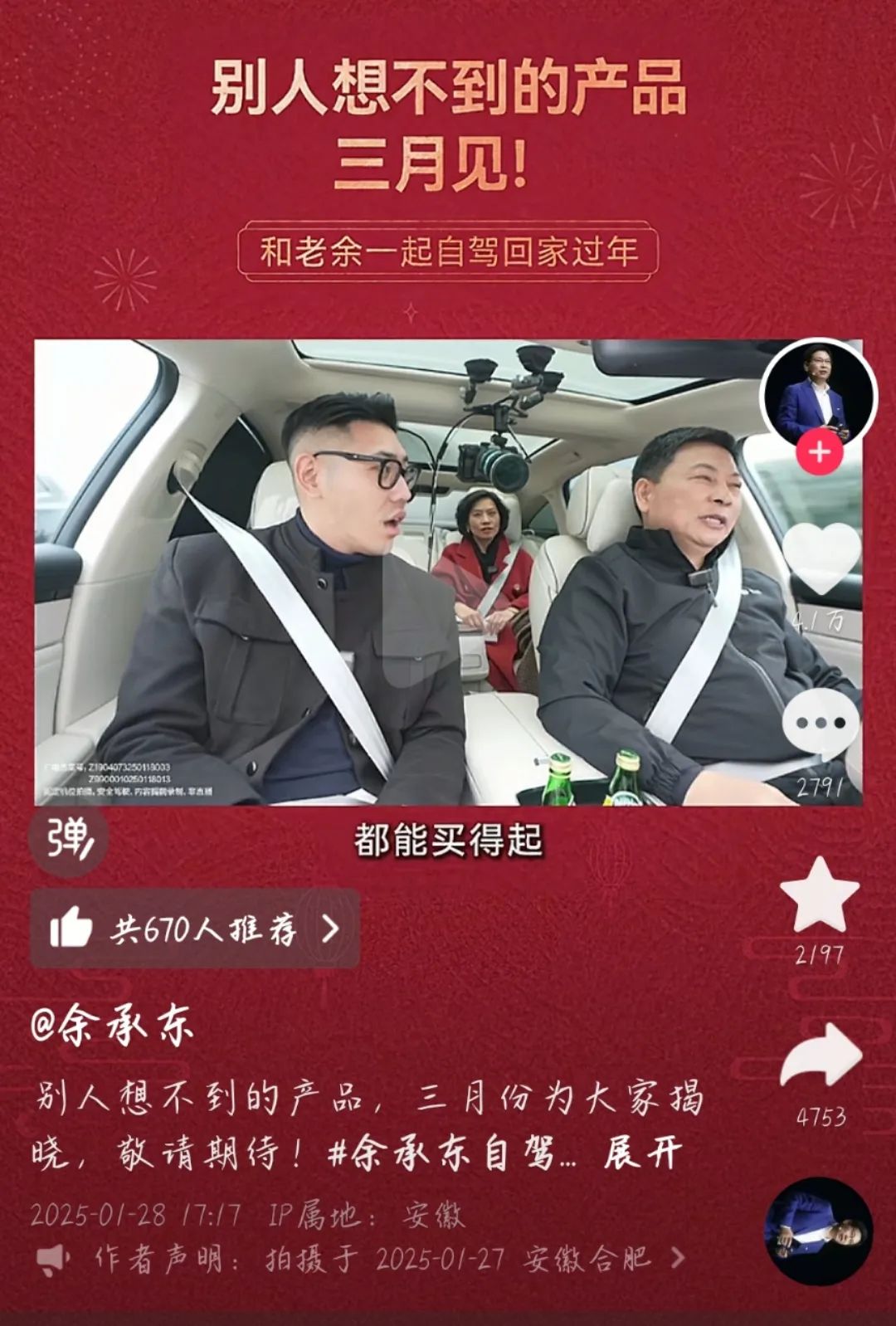 雷達財經注意到,此前在1月28日,華為常務董事、終端BG董事長、智能汽車解決方案BU董事長餘承東在抖音上發佈視頻《別人想不到的產品三月見!》,期間餘承東透露華為3月將推出一款“全國人民買得起、想不到的產品”,當時引發外界廣泛關注。