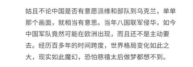 現在你説要中國往烏克蘭這樣的歐洲國家派遣軍隊——哪怕只是維和部隊,這是不是就意味着今後中美兩國的軍事力量要在歐陸上共存呢?還是美軍扔下歐洲人拍拍屁股跑了,完了就把烏克蘭乃至是歐洲的防務這麼大個爛攤子全甩給解放軍?昔日,八國聯軍悍然入侵華夏故土;如今,神州王師或將踏上歐洲大地。“姑且不論中國是否有意願派維和部隊到烏克蘭,單單那個畫面,就相當有意思。”
