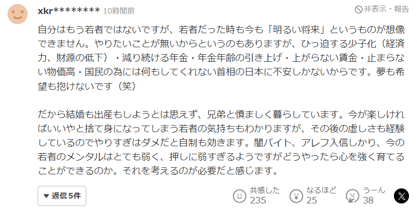 雖然我自己已經不再年輕,但即便是在我年輕的時候,也無法想象所謂的“光明未來”。這不僅是因為我沒有特別想做的事情,更是由於對諸多社會問題的擔憂:少子化帶來的經濟和財政資源的減少、不斷下降的養老金水平、提高的退休年齡、停滯不漲的工資、持續攀升的物價,以及未能為國民帶來福祉的政府領導人。在日本,這一切都讓人感到不安,以至於無法懷抱夢想或希望。