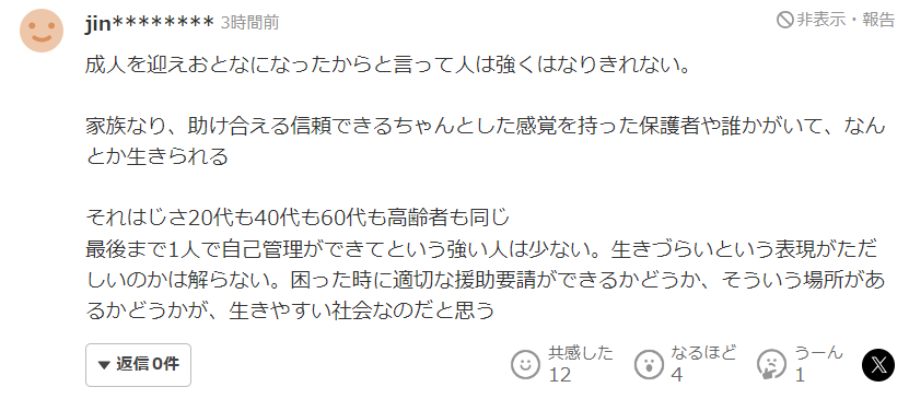不論是二十多歲、四十多歲、六十多歲還是老年人,如果能有可以依賴、能夠相互支持並且擁有可靠判斷力的家人、朋友生活才能活下去。能夠獨自一人處理好一切的強者畢竟是少數。關鍵在於在遇到困難時能否進行適當的求助,社會中是否存在這樣的援助機制,這才是決定一個社會是否容易生存的重要因素。