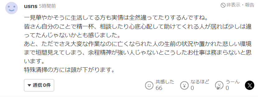 看起來活得光鮮亮麗的人,實際情況可能完全不同呢。每個人都在為自己的生活忙碌,如果有可以傾訴或者真心願意幫助自己的人存在,情況或許會有所不同。此外,特殊清掃的工作本身就已經相當困難了,還需要面對逝者生前的處境和他們所處的悲傷環境,如果不是精神極其堅強的人,恐怕很難勝任這份工作。我對從事特殊清掃工作的人員深感敬佩。