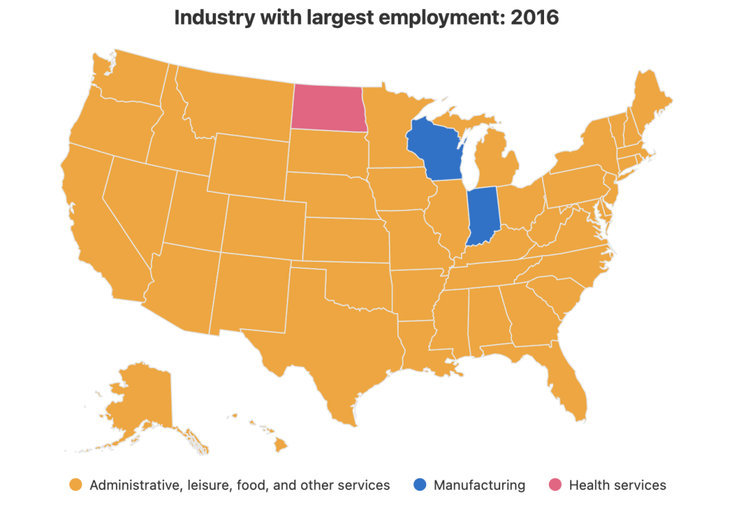 1940 年與 2016 年美國各州提供最多就業的行業,分為:零售業(深藍色);製造業(天藍色);農業和礦業(淺藍色);餐飲旅遊等服務業(黃色);醫療業(紅色)。來源:The Georgetown University Center on Education and the Workforce