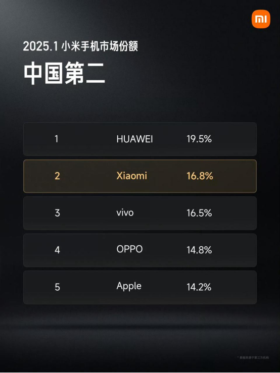 更關鍵的是,今年1月,小米手機的國內市場份額躍升至16.8%,超越vivo、OPPO,僅次於華為,成為市場第二。而且在去年全球手機出貨量TOP3中,小米是唯一正增長的品牌。