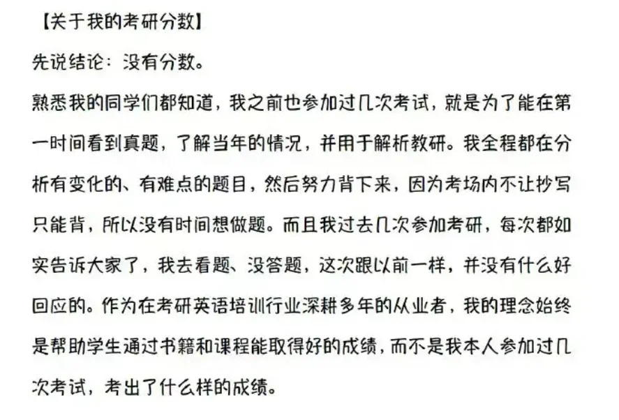 這樣的説法顯然説不過去。有教考研數學的老師加入了團戰,指責田靜誠信有問題,“0分也是成績,只要進考場就沒有沒成績這個説法”。