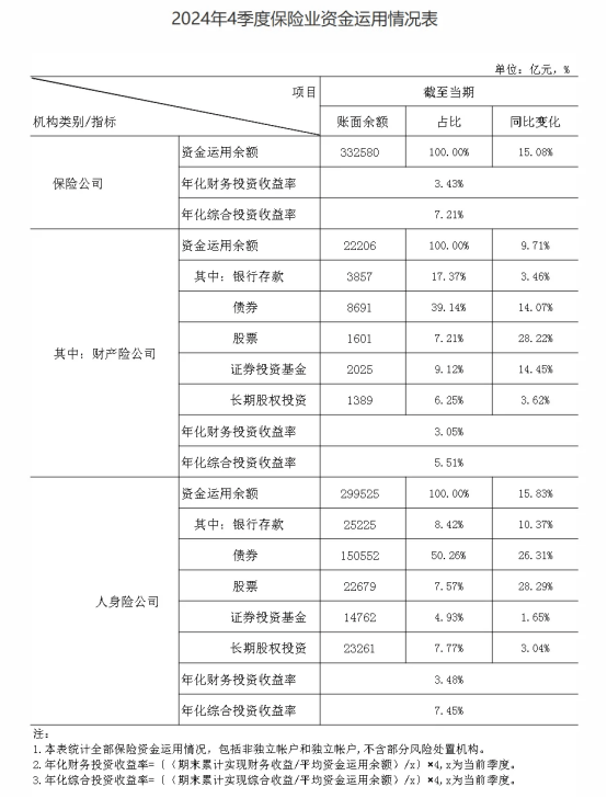 從2024年4季度保險業資金運用情況表來看,人身險公司股票投資2.3萬億,佔資金運用餘額比7.57%;基金1.47萬億,長期股權投資2.3萬億。