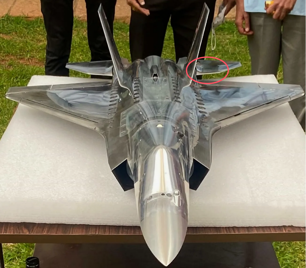 阿三對公版的修改,其實也不多,主要集中在機頭的座艙,換了一個碩大的座艙,寬度高度類似F-35,另外一個則是平尾,做了一個雙後掠設計,該設計構思來源於達索公司給他們的LCA戰鬥機機翼原版。