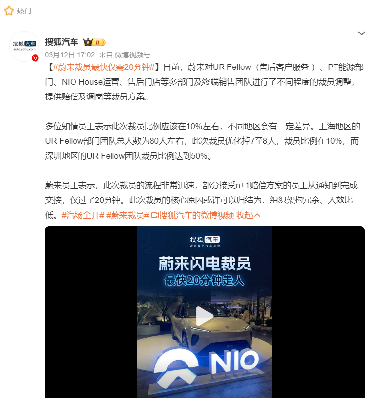 奉瑋離職前,蔚來兩位歐洲高管跳槽極星;汽車數字座艙與軟件開發副總裁張磊也因為個人原因離職,而這些高管離職都發生在2024年。時至今日,網傳蔚來被爆裁員10%,公司對UR Fellow(售後客户服務 )、PT能源部門、NIO House運營、售後門店等多部門及終端銷售團隊進行了不同程度的裁員調整,提供賠償及調崗等裁員方案。