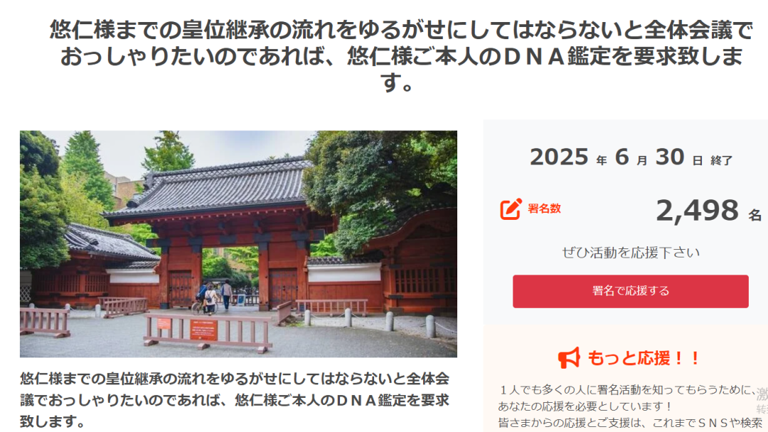 今年2月的時候,之前曾投票反對悠仁通過推薦入學進入東大的“赤門network”,再次發起要求對悠仁親王殿下進行DNA鑑定的請願書,目的是要求悠仁殿下進行DNA鑑定以證其皇室血統純正,來平息外界對於其是否具備合法繼承資格的爭議。投票的截止日是2月16日,有超過一萬名網友表示支持,大家強烈要求悠仁去做DNA鑑定。