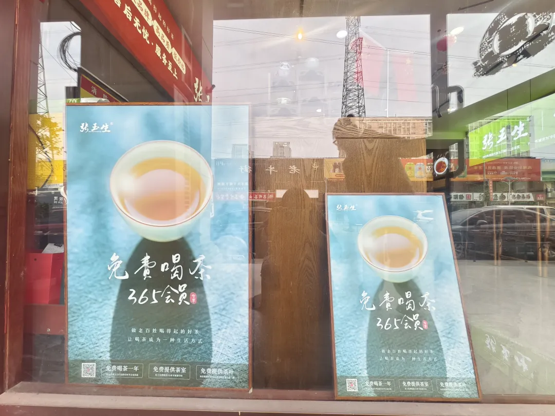 紅底黃字的大俗配色,“365天免費喝茶”“一個免費喝茶的地方”等大白話式的廣告語,以及店內大面積的白牆和貨架,在茶館界可謂格格不入。