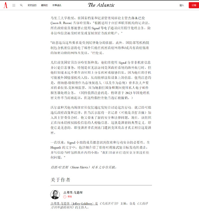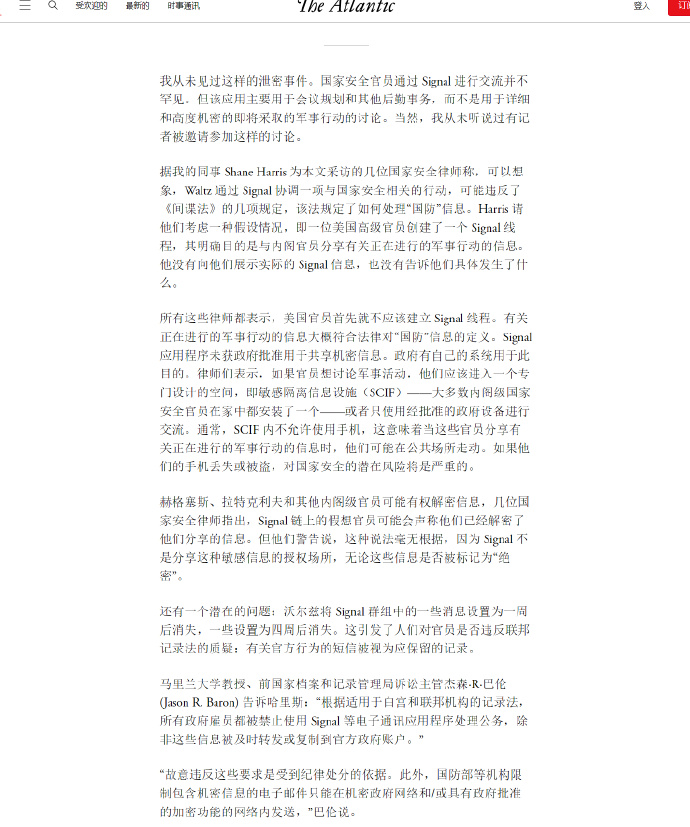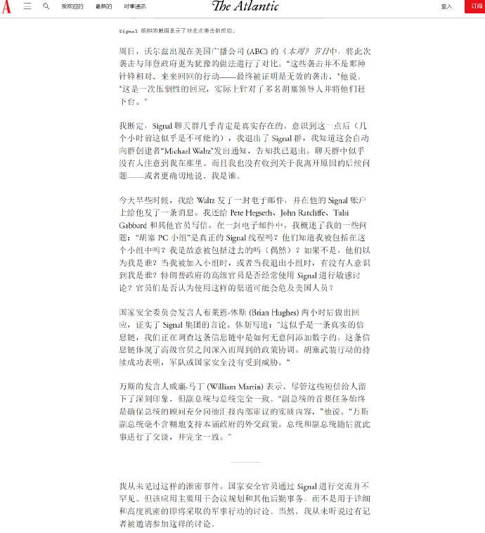 🔻《大西洋月刊》主編傑弗裏·戈德堡這個時候斷定:這個 Signal 聊天羣幾乎肯定是真的!意識到這一點後,他馬上退羣了,他知道這會自動向羣創建者“邁克爾·華爾茲”發出通知,告知他已退羣。在此之前,聊天羣中似乎沒有人注意到他在羣裏,而且他也沒有收到關於他退羣以後的後續問題——或者更確切地説,“我是誰”、“我為什麼會在這個羣裏”、“我到底做了什麼”。