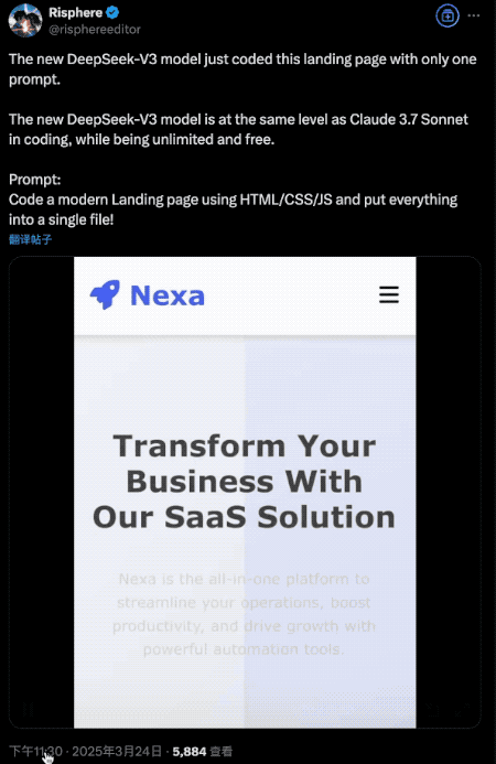 編程這塊,只需一句提示詞開發一個完整產品着陸頁,帶自適應佈局帶動效,被評價為與Claude 3.7 Sonnet同一水平。