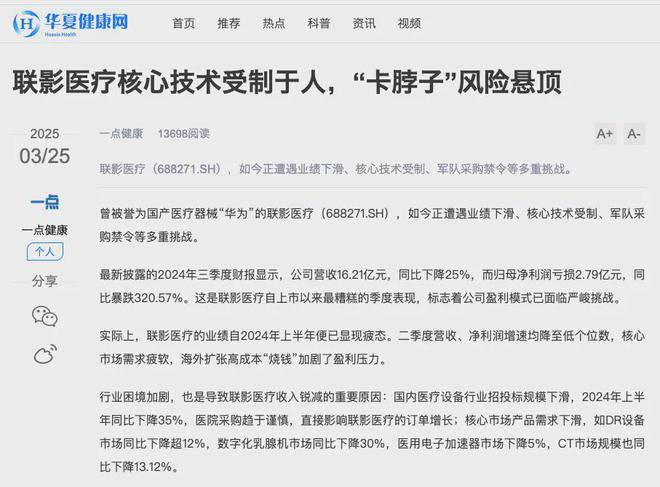 曾被譽為國產醫療器械“華為”的聯影醫療(688271.SH),如今正遭遇業績下滑、核心技術受制、軍隊採購禁令等多重挑戰。