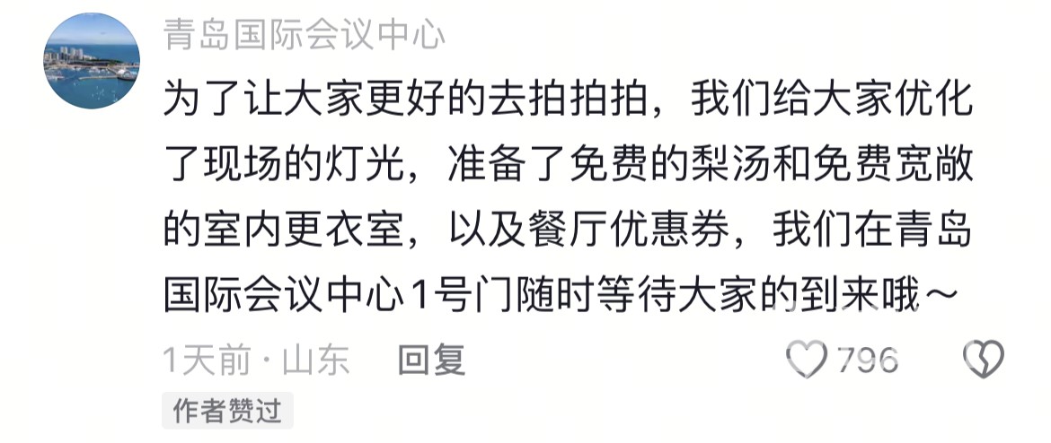 (來源:網絡截圖)當前,全國一批城市以各種方式出圈走紅,在線上線下掀起一波波的城市文旅熱。璀璨之夜,光影盛宴,“流量”要能轉化為“留量”。“鄭州東站”這波流量熱度屬實讓青島“蹭到了”,還“蹭”得很貼心。隨着視頻持續爆火,青島國際會議中心直接開啓“花式寵客”模式,不僅現場準備了免費的梨湯和免費寬敞的室內更衣室,還專門鋪設了紅毯,燈光也進一步優化,還現場提供立體環繞音響。