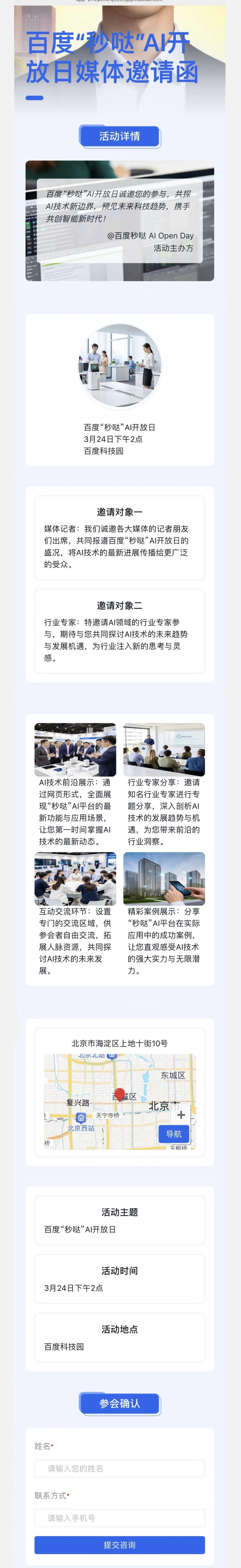 理所當然,先讓秒噠給今天的AI開放日做了一個媒體邀請函,使用的prompt非常簡單,僅提示了時間地點等關鍵詞,「生成百度“秒噠”AI開放日的媒體邀請函,地點在百度科技園,時間為3月24日下午2點」。