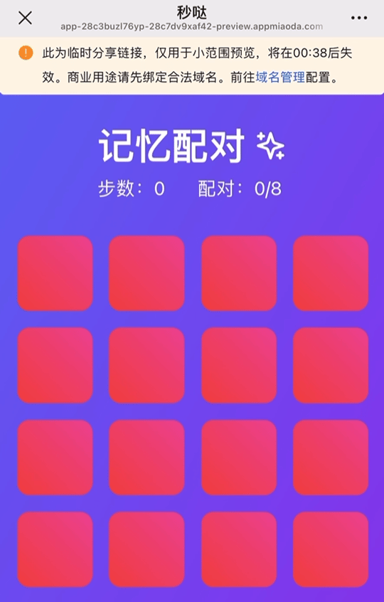 最後,我們來一波童年懷舊,用秒噠搭建了一款卡牌配對小遊戲,翻到兩個相同的圖片後即為配對成功,可以得分。這種鍛鍊記憶力的遊戲,很多盆友小時候大概都玩過吧。