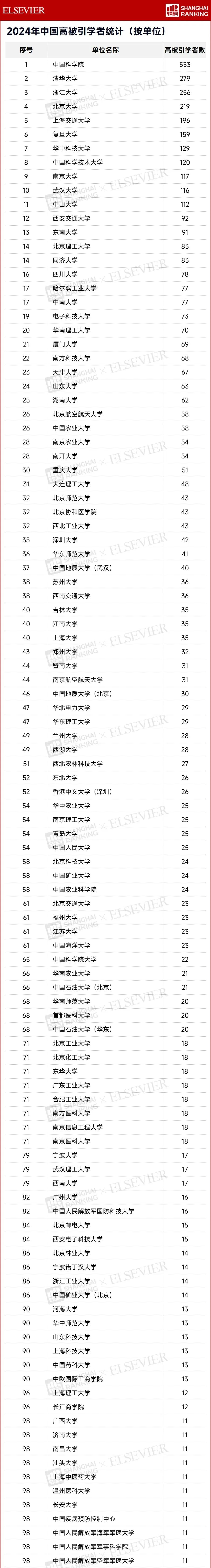 2024 年中國高被引學者所屬機構中,中國科學院擁有最多的高被引學者,共 533 位。高校中,共有 10 所大學的高被引學者數量超過了 100 位,分別是清華大學(279 位)、浙江大學(256 位)、北京大學(219 位)、上海交通大學(196 位)、復旦大學(159 位)、華中科技大學(129 位)、中國科學技術大學(120 位)、南京大學(117 位)、武漢大學(116 位)、中山大學(112 位)。(“愛思唯爾科研醫學服務”微信公眾號,“軟科”微信公眾號)