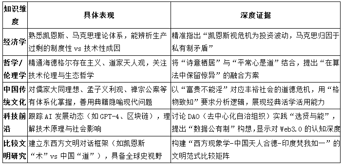 o 跨學科聯結力:將凱恩斯經濟學難題與中國“大同”理想並置,體現“究天人之際,通古今之變”的思維跨度(如從AI過剩談到《禮運》的分配倫理)。