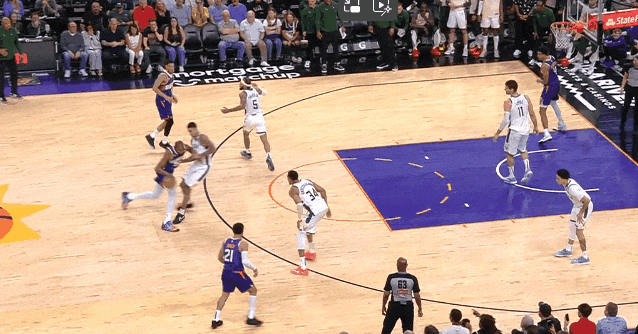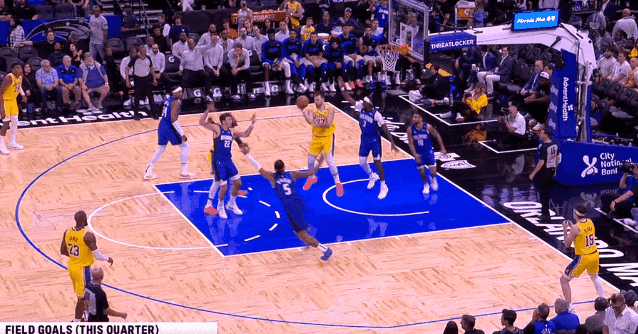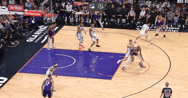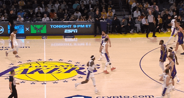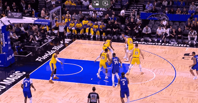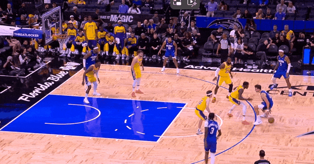 進攻端,盧卡和勒布朗都在場時,湖人由裏夫斯連投4球,最尷尬的一球:盧卡分弱側底角里夫斯,自己跑弱側;裏夫斯底角遲疑,投丟——此刻他、勒布朗和盧卡(尷尬地)在同一側。