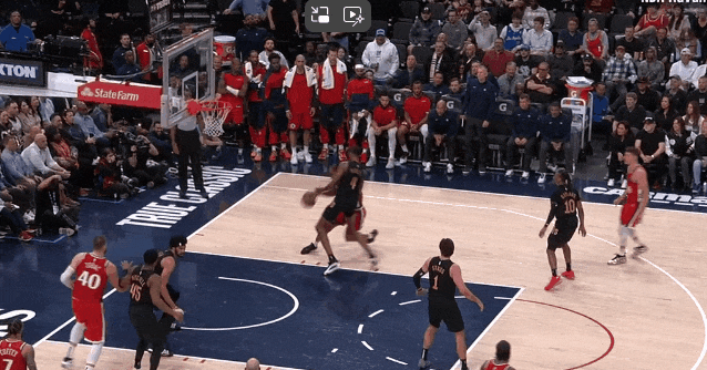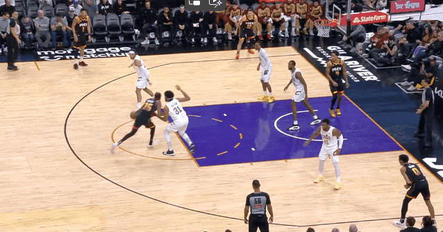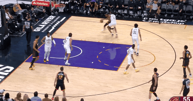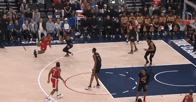 這是裏夫斯處境的縮影:他的理想位置該是盧卡或勒布朗之一的弱側副攻,但他們三人同場時,時不常會這樣跑重了。上一場他積極衝前場籃板導致了幾次退防失位,今天這個連投4球,就有點打到哪兒是哪兒之感。
