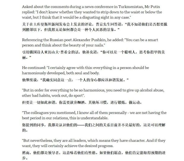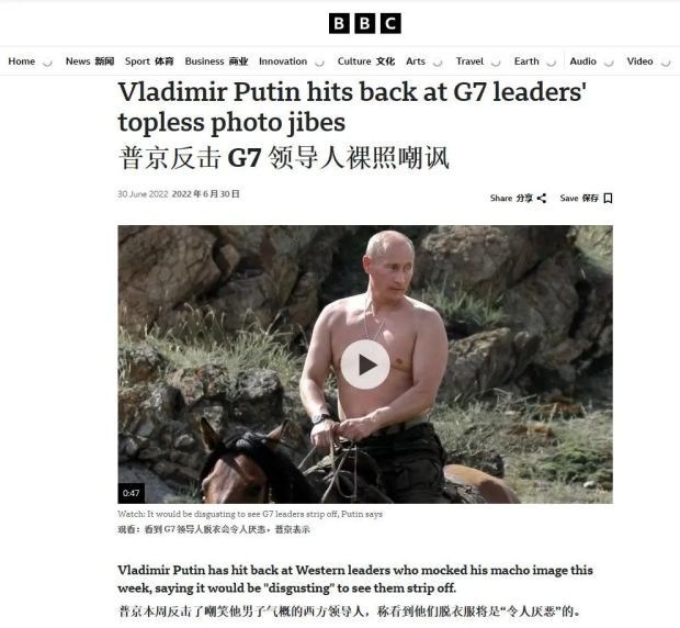 你別説,普京後來還真就這事出面作出回應了。他在記者會上反駁約翰遜等G7領導人調侃自己的言論,説:“我不知道他們所謂的光着膀子到底是幾個意思,你們想脱到哪個份兒上?是脱到腰呢,還是把腰以下的也脱了?無論如何,這樣的畫面都令人作嘔。俄國詩人普希金曾經説過:一個有內涵的人,也是可以注重自己的外貌的。我對此表示認同。人的靈魂與肉體應當和諧發展。但要達到這種境界,一個人就必須戒除煙酒和惡習,堅持強身健體。雖然我們和G7關係不佳,但這些領導人還挺有個性的。最起碼他們現在已經開始討論鍛鍊身體的問題,這一點值得表揚。”