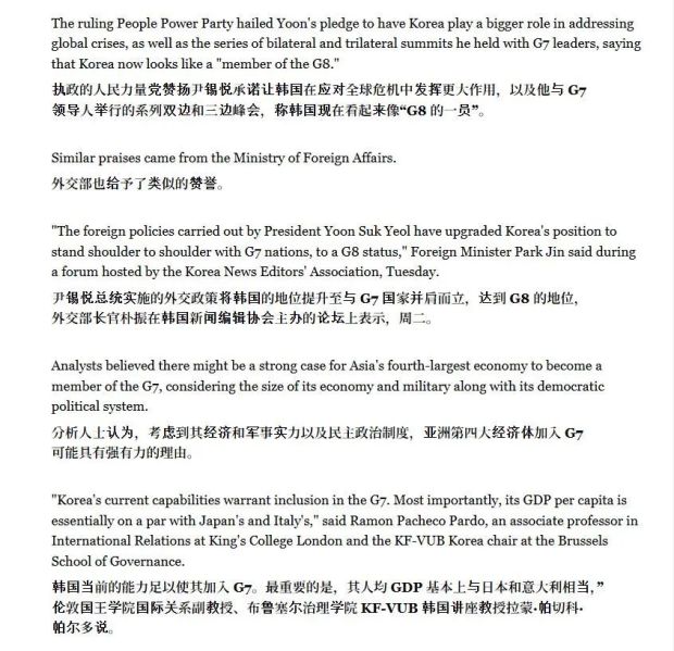 不僅如此,文章還援引時任韓國外長樸振的話稱:“尹錫悦總統的外交政策,已將韓國地位提升至與G7國家並肩的G8級別。”
