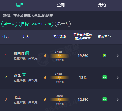 據云合數據顯示,截至發稿前,《雁回時》正片有效播放市場佔有率為19.9%,位居連續劇熱播榜第一。