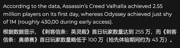 Tom Henderson提到的內部數據,來源於育碧自家的數據跟蹤工具,具備較可靠的橫向參考性。《刺客信條:影》頭兩天的準確玩家數量為220萬,作為對比,《刺客信條:奧德賽》首日玩家數量略低於100萬,《刺客信條:英靈殿》首日玩家數量則是255萬。