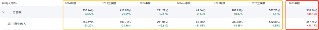 從不同季度來看,金地集團的總營收數據呈正增加的還是2023年中報,這之後的營收數據全部為負數。尤其是進入到2024年開始,降幅比越來越大,一季度降幅超過50%,到2024年年中,降幅達到42.67%。