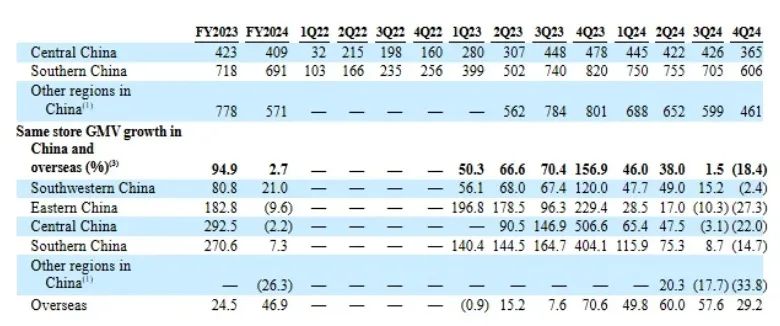 其中,繁華的華東地區下滑最為明顯,下滑幅度高達27.3%。這裏也是霸王茶姬門店數量最多的區域,接近2000家。