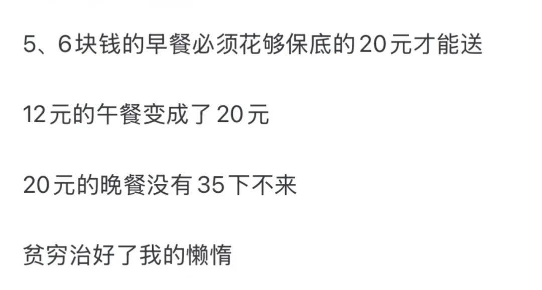 原本5、6塊錢就能解決的早餐,因為不夠起送價,東拼西湊最後一結賬,變成了20幾塊。