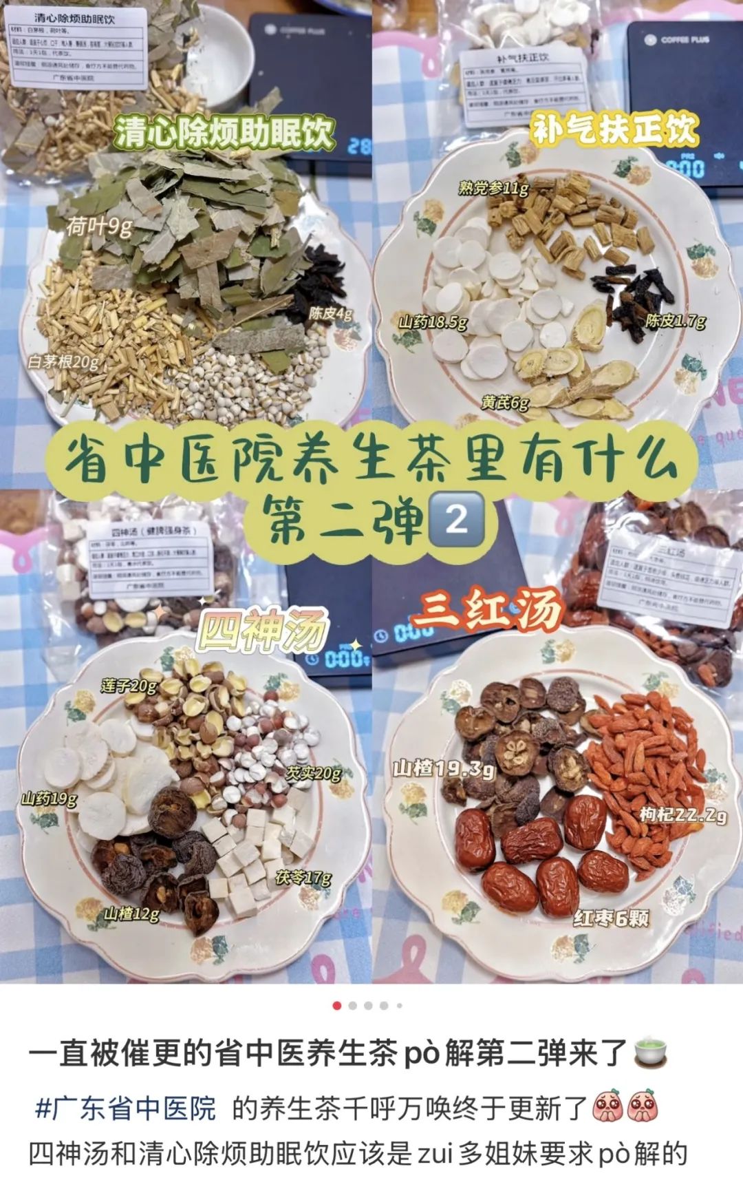 比如廣東省中醫院大火的“清心除煩助眠飲”“補氣扶正飲”“四神湯”“三紅湯”。